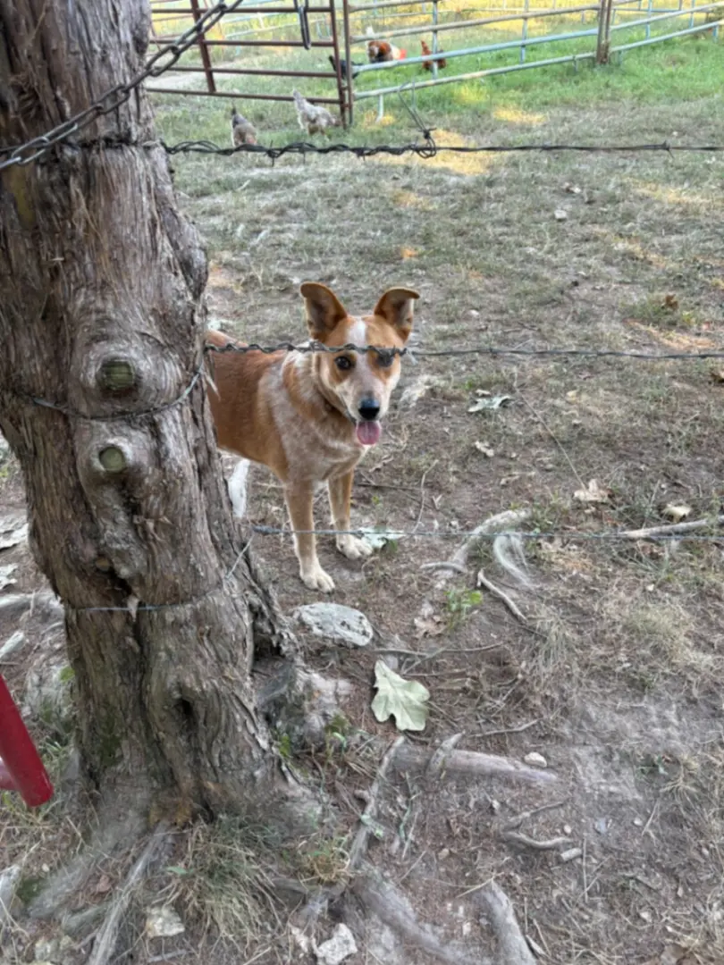 2 year old Red Heeler/Australian Shepherd cross. He is neutered and up to date on shots for this year. He does not chases chickens and does a good job of keeping pests out of the yard.
