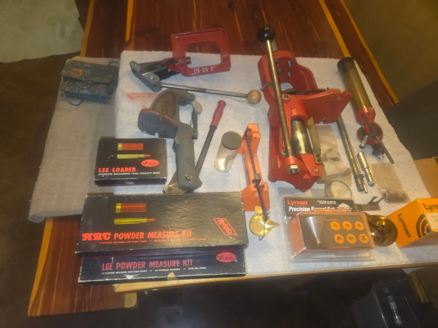 Hornady projector progressive press with powder drop and #8 shell plate,Lee single stage reloader and a Lyman press.several powder measuring sets and misc funnels and ect. Text or call 6362two2117one